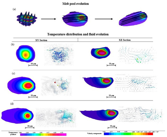 Evolution of melt pool geometry (a); evolution of temperature gradient and fluid flow at initial (b), intermediate (c), and end (d) positions of single scanning track in XY and XZ sections, respectively.