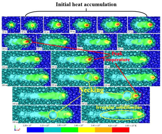 Figure 13 shows the change in the temperature distribution and surface morphology of the melt pool during one single-track scanning within 400 μs. The temperature in the melt pool in the initial position is relatively lower, increasing to a peak temperature of about 5000 K and in only about 80 μs (from 60 μs to 140 μs). It then decreases again to about 3400 K, which is about the evaporation temperature. However, as the laser scanning process progresses, the temperature in the melt pool reaches about 5000 K again, but it cannot remain longer than 100 μs. Because the temperature in the melt pool fluctuates with the laser scanning process, its period is about 100 μs. Its fluctuation mechanism is revealed by the fluid flow in the melt pool, causing fast heat diffusion.