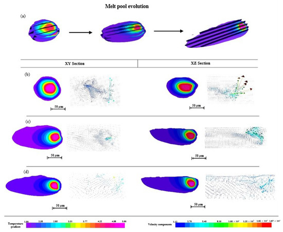 The melt pool becomes deeper and longer with the continuous laser scanning process. There is more space for the melt metal to flow and make it possible to form a continuous and steady flow in the opposite direction to the laser scanning (Figure 12c,d). Furthermore, the temperature gradient and fluid flow in the XZ sections in Figure 12 show the melt metal flows steadily only for a short period of time and then moves like a vortex, which causes the surface of the melt pool to not be smooth.