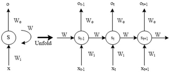 An RNN is a dynamic neural network with an internal connection that can utilize past information and past states for the present state estimation []. Figure 1 is the structure of the RNN in the time step. RNNs also have a hidden state vector or memory and generate an output. The RNN has difficulty learning long input sequences and can easily produce gradient explosion or disappearance.