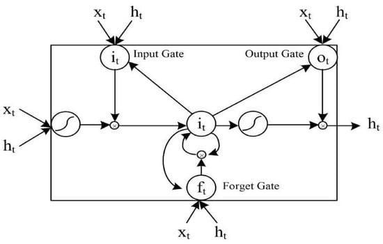 LSTM, a variant of the RNN architecture, designs a unique LSTM unit that can preserve past information and past states and learn sequential information with long-term dependencies. In Figure 2, the structure of the LSTM is presented, and the LSTM forward calculation formulas are as follows []: