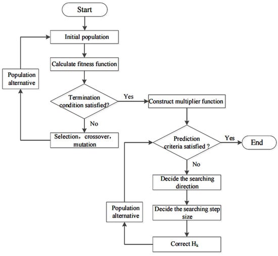 In Figure 3, the specific steps of the hybrid algorithm are listed below. First, we determined a series of convergent populations that fulfilled the constraints through the GA and selected and retained suitable individuals to solve the initial value of the SQP. Second, we constructed a multiplier function to determine whether the prediction criteria were satisfied. When the prediction criteria were not met, the vector of the local search was identified, and the minimum point in the direction was continuously determined.