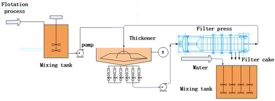 Under the flotation process, the ore slurry is concentrated by a thickener. In this work, to measure the feed concentration properly, we focused on the feed process. The slurry produced by the flotation process is merged into the slurry pump pool and then discharged from the slurry pump to the thickener for the thickening process. The slurry pipeline is equipped with a flow meter. The velocity of the feed slurry discharged into the thickener can be detected online but not the density. The feed slurry enters the thickener for settlement, and the slurry flows out from the bottom discharge port into the dehydration process. It is impossible to calculate the real-time output and cumulative output of the slurry, which makes it difficult to achieve optimal control of the production process. Because the feed density in the thickener is currently the key index for the thickening process, this study focused on the online measurement of the feed density. The process flow chart from flotation to thickening is shown in Figure 5.