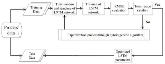 To satisfy the measurement requirements, the intelligent model focuses on constructing an accurate estimation. However, it is worth noting that LSTM network models have numerous hyperparameters that need to be continuously modified to obtain the most suitable results, such as the time window size and network structure []. Selecting the best hyperparameters is essential to optimize the validation errors, but it is extremely time-consuming. Therefore, the most commonly used method in hyperparameter estimation is the trial-and-error method based on heuristics. However, the limitations of computation level and time make it impossible to traverse the entire parameter space []. Thus, a new method is needed to optimize the verification error for both boosting accuracy and saving time, which can ensure the accuracy of the soft sensors in industrial processes. The genetic algorithm (GA) is a classic global optimal method developed by imitating the natural biological evolution mechanism and has attracted much attention in hyperparameter optimization. Most recently, Alshwaheen proposed an LSTM-RNN model to forecast the deterioration of ICU patients and used a modified GA to optimize the observation window to increase the accuracy []. Danial developed both ANN and GA-based ANN techniques for the prediction of AOP []. Zhang et al. combined a support vector machine (SVM) with GA to predict the moisture in oil-immersed insulations and obtained highly accurate results [].