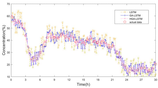 Comparison results of LSTM, GA-LSTM, and HGA-LSTM.