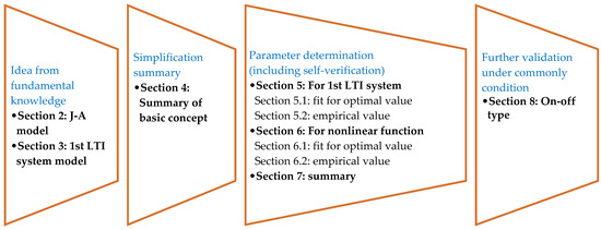 A simplification idea can be realized from the discussions in Section 3.1, Section 3.2 and Section 3.3. When the magnetic field intensity is low, the hysteresis loop of magnetization is wide, the variation in the nonlinearity of the anhysteretic magnetization is weak, and magnetization can be illustrated by the first-order LTI system model expressed as Equation (3). In contrast, when the magnetic field intensity is high, the variation in the nonlinearity is strong, the loop is narrow, and magnetization can be described using the simple nonlinear function shown in Equation (5). Then, one obtains the magnetization model expressed by