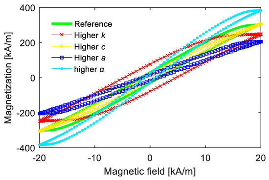 Figure 2 shows the description effect of the Jiles–Atherton model on magnetic hysteresis with different parameters. Roughly speaking, the values of k and c mainly influence the width of the hysteresis loop, and an increased k value or a decreased c value is helpful for a narrower hysteresis curve. The values of a and α mainly affect the slope of anhysteretic magnetization, and one obtains steeper slopes with higher values of α or lower values of a. As the scale parameter of Man, the saturation magnetization Ms mainly influences the magnification degree of the magnetization value.