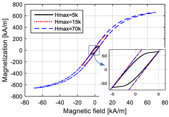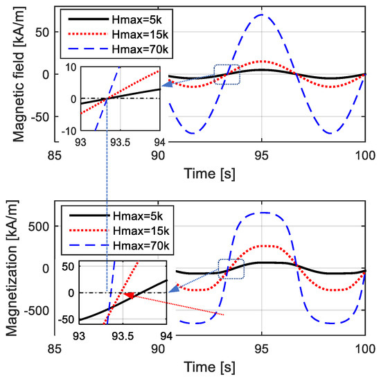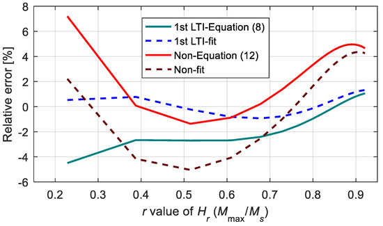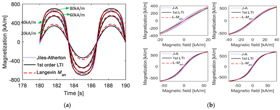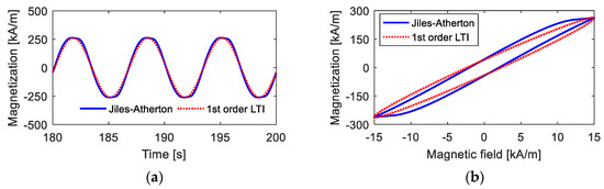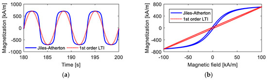 However, when the maximum value of the magnetic field intensity Hmax is high, as shown in Figure 6, the deviations between the results calculated from the first-order LTI system model and those calculated from the Jiles–Atherton model are quite high. With a high magnetic field, the time-domain curve of magnetization deviates far from standard sinusoidal curves. Moreover, under this condition, anhysteretic magnetization Man has a strong nonlinearity, indicating that the hysteresis loop has a large bending, and the first-order LTI system cannot describe a curved hysteresis loop, as analyzed in Section 2.2.