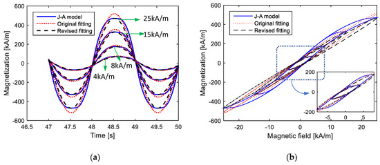 Moreover, the equivalent phase lag could be determined by using Equation (4) to directly fit the calculated results of the Jiles–Atherton model. Of course, the direct fitting method, using the least square fitting method, takes into account both the amplitude and phase lag, and it indicated that the amplitude of magnetization was not determined so accurately.