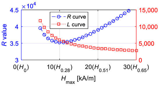 The values of R and L computed from the equivalent phase lag and Mmax are time-independent and related to the material properties. The main concern is that they are not independent of the maximum magnetic field intensity Mmax. Figure 8 provides the optimal values of R and L at different values of Hmax.