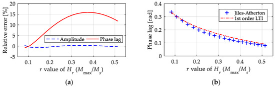 We extracted the relative errors of the first-order LTI system model when computing the amplitude and equivalent phase lag, and they are shown in Figure 10, in which the abscissa variable is used as the r value of Hr to represent the magnetic field intensity with an amplitude from 5 kA/m to 25 kA/m. From the results of the relative errors, it was observed that the first-order LTI system model could describe the amplitude of magnetization with high precision, as the relative error was less than 2%. In contrast, the proposed first-order LTI system model failed to precisely predict the equivalent phase lag, as the relative error exceeded 15% in some cases. Combined with the absolute value of the equivalent phase lag shown in Figure 10 and the time domain curves shown in Figure 9, this level of calculation accuracy of the equivalent phase lag is acceptable in engineering applications. In fact, the calculation deviation will be weakened when more links are added to the final output.