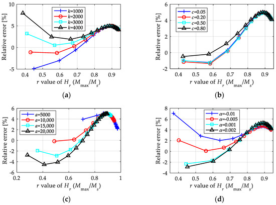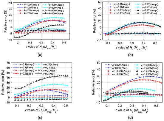 Relative errors of the nonlinear model in calculating the magnetization amplitude and equivalent phase lag under univariate change condition: (a) k ∈ [1000 kA/m, 4000 kA/m], a = 12 kA/m, c = 0.2, α = −0.001; (b) a ∈ [5000 kA/m, 20,000 kA/m], k = 2 kA/m, c = 0.2, α = −0.001; (c) α ∈ [−0.01, 0.002], k = 2 kA/m, a = 12 kA/m, c = 0.2; (d) c ∈ [0.05, 0.8], k = 2 kA/m, a = 12 kA/m, α = −0.001.