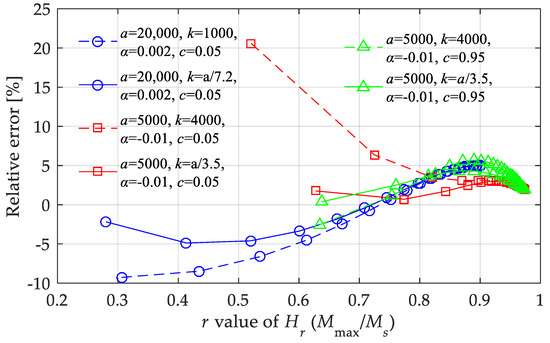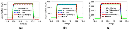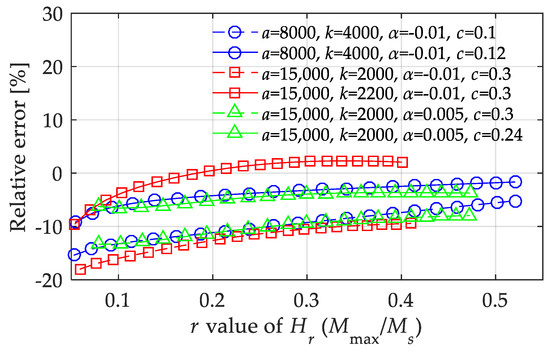 It should be repeated that the empirical equations shown in Equation (15) are not necessary for parameter determination. For specific materials, these parameters are fixed as α, k, etc., in the Jiles–Atherton model. Moreover, all the parameters can be determined using any fitting method or computation after extracting some important characteristic values, as described in Section 5.1 and Section 6.1. In fact, the parameters determined by the fitting method or computation after extraction can achieve better effects than the empirical equations shown in Equation (15), as they do not need to be responsible for other situations.