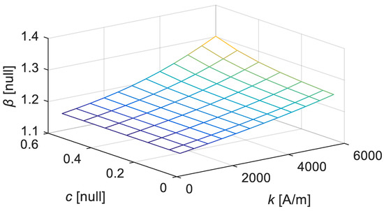 Take k = 2 kA/m, a = 12 kA/m, c = 0.2, and α = −0.001 as the initial values, and change each parameter to obtain the univariate function relationship between the optimal values of AL, BL, CL, DR, ER, and the specified variable, as shown in the figures. The curves shown in Figure A2 were fitted in the simplest format possible. Taking AL as an example, from the univariate analysis, one obtains AL(k) = −16k2 + 6.74 × 104k − 1.638 × 107, AL(a) = 8364a − 4.657 × 107, AL(c) = 2.55 × 108e−7.2c − 7.34 × 106, and AL (α) = −1.17 × 1011α2 − 2.68 × 109α + 5.2 × 107.