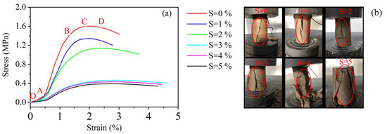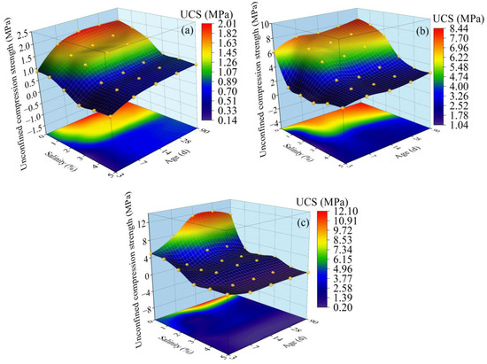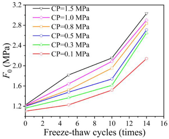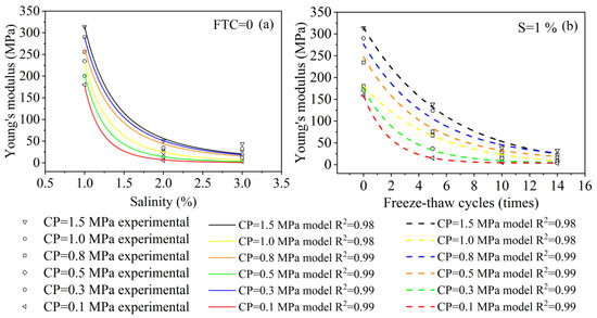 - After curing the saline soils in cold regions, the freeze–thaw resistance of the solidified saline soils is remarkably enhanced, and the stress–strain curve of the solidified saline soils does not show rapid strain softening after FTCs. The effect of FTCs and salt erosion causes peak stress to shift backward at the appearance of Young’s modulus, which indicates that, with increased FTCs and salinity, the resistance to deformation of the solidified saline soil was reduced.