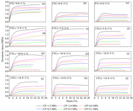 4.1. Changes in the Stress–Strain Relationship for Improved Soils for Different FTCs and Salinities
