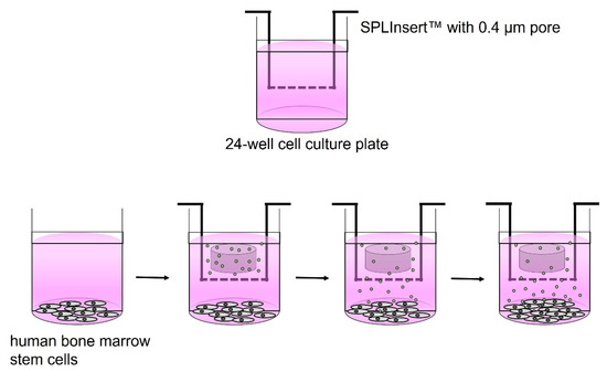 The Cell Counting Kit (CCK-8) test (CK04-13; Dojindo, Kumamoto, Japan) was used to measure the cytotoxicity of four kinds of retrograde filling cement disks. The proliferation of hBMSCs was analyzed 2, 4, and 6 days after incubation. The hBMSCs were cultured at a density of 1.0 × 10⁴ cells/well on 24-well cell culture plates (SPL Life Sciences, Pocheon, Korea) including growth medium. After 24 h of cell adhesion, each disk was placed individually into an insert with 0.4-μm pore (SPLInsert; SPL Life Sciences), and the insert was placed over the attached cells. The optical density was measured after 2, 4, and 6 days after insertion of experimental disks (Figure 1). More detailed methods were described previously [21,22]. Each group was measured in octuplicate.