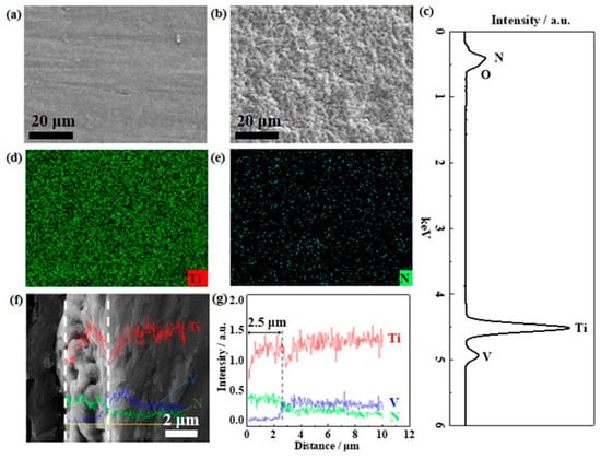 Figure 1a,b show the SEM images of the pretreated Ti sheet before and after the thermal nitriding under NH3 atmosphere. It can be seen that the Ti sheet that has not been nitrided appears as a flat and smooth surface, and there are still scratches left by the mechanical polishing. No obvious defects and porous structures were observed. The scratches on the surface of the Ti sheet after the nitriding under NH3 atmosphere have been completely covered by the nitride coating. In addition, the surface of the coating after nitriding is granular porous structure mainly due to the strong alkalinity and high reducibility of NH3. Meanwhile, the high temperature thermal expansion can lead to rich internal pore-like defects between the particles, but no obvious gaps and cracks appeared. The EDS spectra shown in Figure 1c reveal that the elements present in the nitriding sample are mainly Ti, V and N. From the EDS elemental mappings of the TiN-Ti, both the Ti and N are uniformly distributed, but the specific phases in which they exist need to be further analyzed. Figure 1f,g show the cross-section SEM image and the corresponding EDS liner scans after the thermal nitriding. The results showed that there were significant pore-like defects inside the coating with a thickness of about 2.5 μm. The presence of porous morphology and defects will help to disperse the active components when used as the supporting material, which may significantly enhance the adhesion of the active phases and also increase the number of active sites that can catalyze the OER process [35].