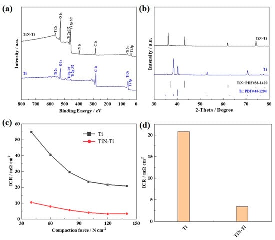 (a) XPS survey spectra, and (b) XRD patterns of the Ti sheet and TiN-Ti, (c) Relationship between the ICR and the compaction force, (d) ICR at 140 N cm−2 of the Ti and the TiN-Ti.