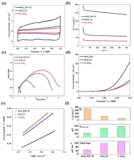 Figure 4b shows the voltametric charges for the C-IrO2 and the supported catalysts obtained at different potential scan rates. It could be seen that the charges show a significant decrease trend as the sweep speed increases, which is due to the hysteresis of charge transfer or the relatively slow transfer speed [38]. At high sweep speeds, charge transfer can only occur at the active interface (“outer” surface) in direct contact with the electrolyte, corresponding to the outer surface charge (Qo); At low sweep speed, proton exchange energy occurs at the active interface of the entire electrode (the “internal” interface and the “outside” surface of the proton conduction) slowly, corresponding to the total electrode charge (Qt) [18,21]. Table 1 and Figure 4f list the calculated Qo and Qt of the synthetic electrodes according to literature. Compared with the IrOx/Ti, both the Qo and Qt have been significantly improved, indicating that the unique porous structure and internal pore-like defects in the TiN-Ti promote the dispersion of the active components, as well as the accessibility of the catalytic sites. In addition, according to the literature [40,41,42,43,44,45], the presence of a porous structure with abundant macropores (or mesopores with a large pore size) in the catalyst support (i.e., TiN-Ti) facilitates fast mass transport, resulting in improved electrocatalytic performance.