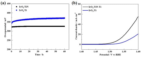 (a) Chronopotentiometric curves of the IrOx/TiN-Ti and IrOx/Ti recorded at a constant current density of 10 mA cm−2. (b) iR-corrected steady-state polarization curves of the IrOx/TiN-Ti and IrOx/Ti after 60 h of OER.
