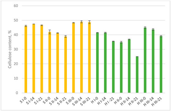 Cellulose content at three mycelium biocomposites’ development stages: start point (0 days), 14 days, and 21 days (final sample). S = sawdust; H = hemp; I, II, III = variants.