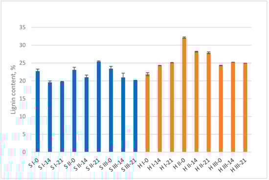 Lignin content at three mycelium biocomposites’ development stages: start point (0 days), 14 days, and 21 days (final sample). S = sawdust; H = hemp; I, II, III = variants.