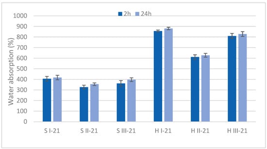 The water absorption properties of developed MB specimens were determined after 2 h and 24 h immersion (Figure 3). Absorption within 2 h was a critical duration after which the water uptake of MB was limited. Hemp specimens had the highest water absorption, reaching 630–880% after 24 h. Significant difference (p < 0.05) was determined in all hemp variants both after 2 h and 24 h, with the highest absorption for variant H I, followed by H III, and H II with the lowest value.