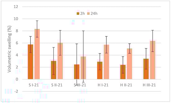 The volumetric swelling of MB specimens after 2 h and 24 h is shown in Figure 4. Significant positive correlation in sawdust variants after 2 h and 24 h was determined (r = 0.65). The highest swelling was observed for sawdust S I in 2 h and 24 h period, ~6% and 8%, respectively. The swelling of other sawdust and hemp specimens after 2 h was in 2–3% range, and after 24 h it was around 6%. Contrary to the water absorption properties, the difference in volumetric swelling between 2 h and 24 h in most specimens was twice higher. There was no clear effect of bark additive in the reduction of swelling performance.