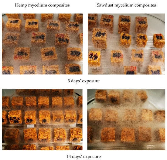 Hemp and sawdust containing mycelium biocomposites after 3 and 14 days exposure to mold contamination.