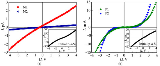 - Pavlikov, A.V.; Forsh, P.A.; Svyakhovskiy, S.E.; Matsukatova, A.N.; Forsh, E.A.; Kazanskii, A.G.; Kashkarov, P.K. Giant enhancement of free charge carrier concentration in boron-doped amorphous hydrogenated silicon under femtosecond laser crystallization. Appl. Phys. Lett. 2018, 113, 203103-1–203103-5. [Google Scholar] [CrossRef]