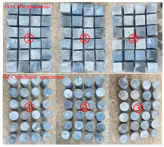 The cubic and cylindrical HPC specimens. (a) cube specimens, ① group 1, ② group 2, ③ group 3, (b) Cylindrical specimens, ① group 1, ② group 2, ③ group 3.