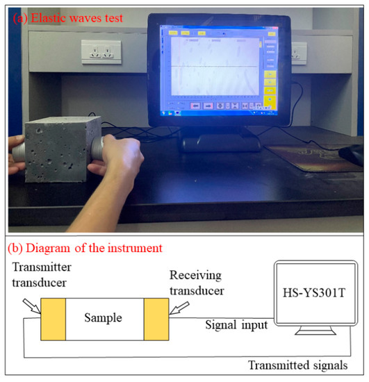 The elastic modulus of the cube specimens was tested using a HS-YS301T acoustic tester (Hongshen, Hunan, China). In the test, the propagation velocity of ultrasonic wave in the tested material is calculated by the wave amplitude, initial arrival time, and the known distance of material, so as to obtain the dynamic elastic modulus. Using density and measured p-wave and s-wave wave velocities ( and ), the dynamic elastic characteristics of specimens can be calculated as follows [35],