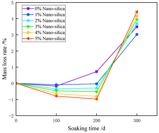 The mass change of HPC specimens at a predetermined time after sulfate corrosion was extracted to the mass loss rate curves, as exhibited in Figure 4. After soaking in sulfate solution for 100 days, the mass loss of unmodified HPC specimen is unobvious, but subsequently increased after 200 days of soaking, and accelerated at 200–300 days. The incorporation of nano-silica (NS) decreased the mass loss, especially at early ages. It can be seen that after soaking for 100 and 200 days, the NS additives even slightly increased the mass of HPC specimens, and this effect was augmented with higher NS addition. However, the long-term effect of NS seemed opposite to that at the early ages. After soaking for 300 days, the greatest mass loss was obtained in the 5% NS specimen, which is 26.5% larger than that of unmodified specimen (4.421% vs. 3.494%), whereas the 1% NS specimen decreased the mass loss by 13.5% in comparison to the unmodified specimen (3.023% vs. 3.494%).