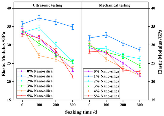 The elastic modulus obtained from ultrasonic waves and strain–stress curves are exhibited in Figure 6. It can be seen that both overall trends of elasticity are consistent with each other, where the initial values are roughly the same among specimens. Then, the elastic modulus gradually decreases with increasing soaking time. The 1% NS and 2% NS modified specimens had greater elastic modulus at every time-point, whereas the 3–5% NS addition led to a reduction in elastic modulus in comparison to the unmodified specimens. Especially, after 300 days of soaking, the elastic modulus was elevated by 50.4% in 1% NS HPC specimens compared to the plain HPC specimen (34.9 vs. 23.2 GPa).