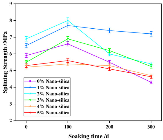 The variations in splitting strength are similar to that of compressive strength, except for a slight increase after soaking for 100 days. As shown in Figure 8, the peak splitting strength of HPC specimens slightly increases after the first 100 days of soaking, and then decreases with increasing soaking time. After soaking for 300 days, it decreased by 37.2% in unmodified specimens (4.3 vs. 5.9 MPa). Consistent with compressive strength, the 1% NS additive is the most effective dosage in front of sulfate attack, which increased by 10.2%, 16.7%, 34.5%, and 69.8% after soaking for 0 day, 100 days, 200 days, and 300 days, respectively. The splitting strengths were mostly higher in 2%–5% NS HPC specimens compared with unmodified specimens, but they were all less than that of 1% NS specimens.