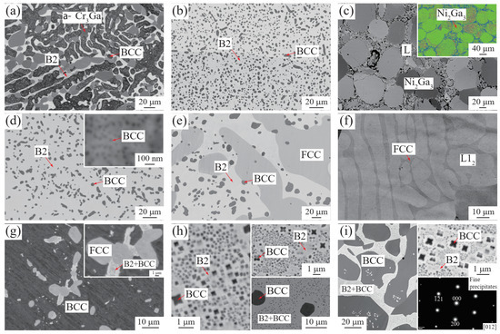 Microstructures of: (a) Ni9.24-Ga20.81-Cr69.95 (at. %, 60 days), (b) Ni46.31-Ga25.36-28.33Cr (60 days) and (c) Ni33.23-Ga62.74-Cr4.03 (2 h, the inset is the EBSD result) annealed at 850 °C, (d) Ni44.19-Ga26.80-Cr29.01 (the inset is a high magnification image), (e) Ni50.20-Ga21.02-Cr28.78 and (f) cold-rolled Ni77.85-Ga18.47-Cr3.68 annealed at 1000 °C for 35 days, (g) Ni7.40-Ga2.68-Cr89.92 (the inset is high magnification image), (h) Ni45.98-Ga25.50-Cr28.52 (the insets are the microstructures formed when annealed at 1150 °C for 24 h (upper) and 1135 °C for 10 days (lower)) and (i) Ni16.54-Ga13.63-Cr69.83 annealed at 1150 °C for 10 days (the insets are the NiGa + BCC region (upper) and the SAD pattern of fine precipitates (lower)).