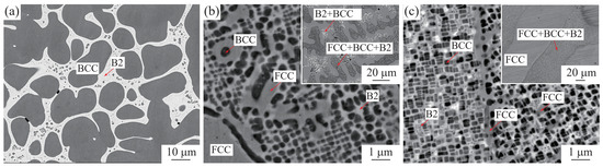 Figure 3a shows the microstructure of the cast Ni16.54-Ga13.63-Cr69.83 alloy, and the BCC is suggested to precipitate from the molten alloy during the solidification first, then, the remaining liquid reacts with the precipitated BCC to form the B2 phase through a peritectic reaction. Moreover, during the cooling of the cast alloy, the tiny BCC phase starts to precipitate from the B2 phase, as suggested in Figure 2g,h, that the precipitation of BCC in B2 is very fast. Meanwhile, not like that in the annealed Ni16.54-Ga13.63-Cr69.83 alloy where the tiny B2 phase is seen embedded in the large BCC phase (Figure 2i), no tiny B2 phase is seen in the large BCC phase in cast alloy (Figure 3a). Therefore, the tiny B2 phase seen in the annealed Ni16.54-Ga13.63-Cr69.83 alloy is thought to form during the annealing process. Figure 3b,c show the microstructures obtained from the Ni42.23-Ga15.70-Cr42.07 alloy under as-cast and after annealing at 1150 °C for 10 days. In the as-cast condition, the dendrite-like FCC, B2 + BCC and FCC + BCC + B2 regions are observed, as seen in the inset in Figure 3b. After annealing, the microstructure consists of large FCC and FCC + BCC + B2 regions, as seen in the inset in Figure 3c. In the FCC + BCC + B2 region (Figure 3c), two kinds of BCC are observed, a large one and a small one. The cuboidal BCC, which shows an edge length close to 500 nm, is believed to form during the annealing process as the mean composition of this alloy is located at the three-phase region of FCC + BCC + B2 at 1150 °C, as indicated by Figure 2g. The very tiny BCC phase is found to be distributed on the B2 phase and is thought to be precipitated during the ice water quenching process. It is the same as that shown in Figure 2g–I, where the tiny BCC phase is seen precipitated in the B2 phase. The co-existing FCC in the B2 phase in the matrix indicates the improved ductility of this alloy. Furthermore, the observed cuboidal BCC was discovered to coherently precipitate on the B2 matrix with cuboidal morphology.