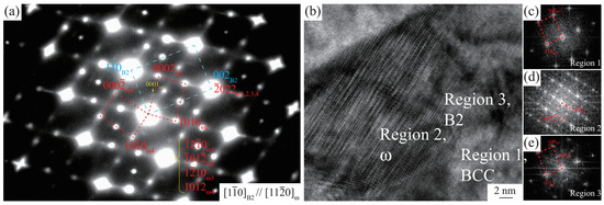 The diffuse streaking is seen in the selected-area diffraction (SAD) pattern obtained from the matrix in the quenched Ni45.98-Ga25.50-Cr28.52 alloy after being annealed at 1150 °C for 10 days, as shown in Figure 4a, and is a typical phenomenon of the presence of a diffuse ω structure. Four ω variants are noted and found to be in the space group of Pm1 due to the presence of diffraction (the very weak spot located at position in Figure 4a), which is forbidden for the P63/mmc space group. The observed ω phase shows a crystallographic orientation of ; with parent phase B2. Moreover, it is reasonable to understand the appearance of Pm1 rather than the P63/mmc space group as the ice water quenching was performed after the annealing of the Ni45.98-Ga25.50-Cr28.52 alloy at 1150 °C. Figure 4b shows the HRTEM result obtained from the FCC + BCC + B2 region (Figure 3c) in the quenched Ni42.23-Ga15.70-Cr42.07 alloy after annealing at 1150 °C for 10 days. No FCC is identified due to the very small region observed. The BCC phase, ω with Pm1 space group, and the remaining B2 phases are identified, as suggested in Figure 4c–e obtained, respectively, from the regions 1–3 in Figure 4b using the Fast Fourier Transform (FFT) method.