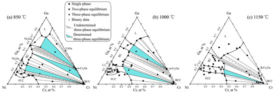 All the compositions measured for the phases in the annealed alloys using EPMA and HRTEM are listed in Table 1, where Cr is selected as the balance element, and the constructed three isothermal sections of the Ni-Ga-Cr ternary system at 850, 1000 and 1150 °C are shown in Figure 5a–c. The three-phase regions are represented by triangles.