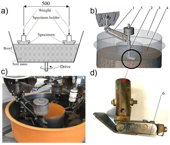A “rotating bowl” test stand: (a) the principle of operation; (b) a scheme of one working section: 1—swingarm, 2—specimen holder, 3—bowl with abrasive mass 4, 5—weight, 6—specimen; (c) general view; (d) specimen holder.