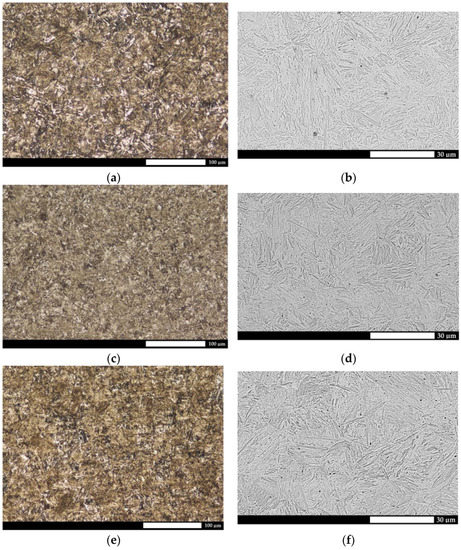 Microstructures of the analyzed abrasion-resistant steels. (a,b) Hardox 500, (c,d) Hardox 600, (e,f) Hardox Extreme. Light and electron microscopy. Etched with Mi1Fe (Nital).