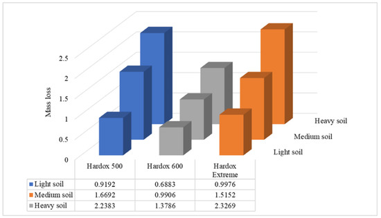 The wear values of the test materials after covering a distance of 20,000 m in particular soils are presented in Figure 4.