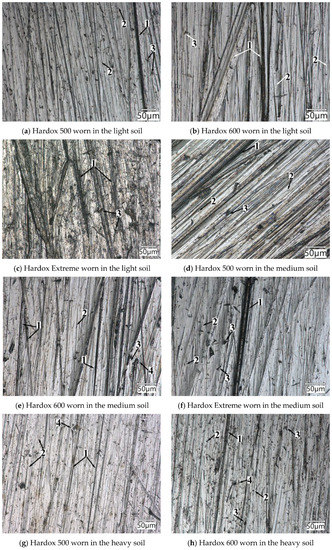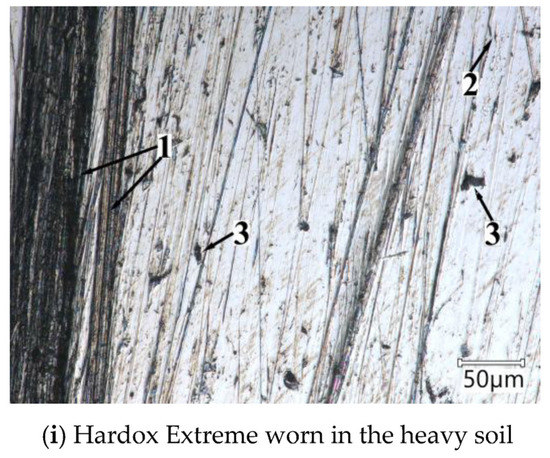 The appearance of the surface of Hardox 600 worn in heavy soil (Figure 5h) indicated the dominance of chipping, ridging, and microcutting in the wear process. Chipping was due to the fact that in this tribological combination, in addition to the typical mechanical wear, classical mechanochemical wear occurred. The ploughing process partially removed material and caused the plastic deformation of the edge of the furrow (pushing material out). The pushed-out material was weakly bonded to the sample surface, which facilitated its removal under the influence of the next abrasive grains. This wear process was promoted by the high contents of silty and dusty fractions (84.18%) and the low sandy fraction content (15.82%). The noted wear by ridging and microcutting resulted from the cutting impact of sand grains fixed in silt and dust.