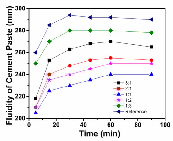 Figure 1 shows the fluidity of the cement pastes mixed with different AMPS–DMAA copolymers at different incubation times. The fluidity of pastes with the addition of AMPS–DMAA copolymers was lower than that of the reference sample (without copolymers), and the values of pastes for A, B, C, D, and E were approximately 218, 210, 205, 210, and 250 mm at 5 min, respectively. The fluidity increased with the increasing time, and leveled off after 30 min. The paste fluidity presented an upward trend with the molar ratio of AMPS and DMAA, whether greater than 1:1 or less than 1:1, and the values from low to high were C < D < B < A < E at the same time. All the copolymers proved to be effective in controlling the segregation of slurry, and copolymer C, with a 1:1 molar ratio of AMPS and DMAA, showed the greatest effectiveness.