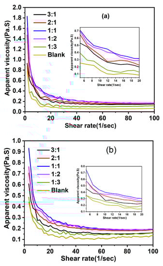 Variation in apparent viscosity with different charge densities of AMPS–DMAA copolymer: (a) 5 min, (b) 90 min.