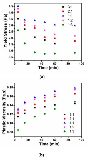 Figure 4a shows the time–yield stress curves of cement pastes. Yield stress was found to decrease with time, which could be attributed to the increasing fluidity with time (Figure 1). The yield stress of the paste with copolymer C was found to be higher than those of the other copolymers, and the values were C > D > B > A > E at the same incubation time. Figure 4b shows the time–plastic viscosity curves of the cement pastes. Plastic viscosity was found to increase with time, which could be attributed to the hydration of cement with time, which caused the paste to stiffen over time [11]. The plastic viscosity of the paste with copolymer C was found to be higher than those of the other copolymers, and the values were C > D > B > A > E at the same incubation time. It could be observed that, when the molar ratio of AMPS and DMAA was 1:1, both the yield stress and the plastic viscosity of the paste were higher than those of the other copolymers, and the values from high to low were C > D > B > A > E. Moreover, for the paste containing any copolymer, A, B, C, D, or E, the yield stress decreased with time and the plastic viscosity increased with time. These results may be attributed to the fact that interactions existed among copolymer–copolymer, copolymer–water, and copolymer–cement particles, which resulted in the formation of a three-dimensional network structure between the liquid phase and the cement particles, further increasing the resistance of the grout to undergo deformation and guaranteeing the overall stability of the pastes [14]. As time elapsed, interactions existing among copolymer–copolymer, copolymer–liquid phase, and copolymer–cement particles gradually diminished, and the three-dimensional network structure disappeared; the stability of the paste was thus broken. The charge density of the copolymer presents a significant effect on the properties of cement pastes.