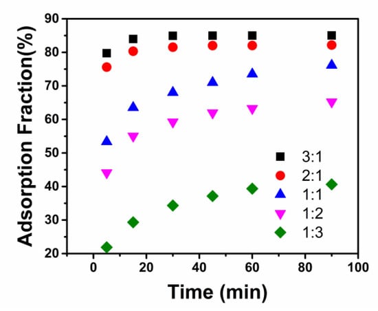 We plot the adsorption rates of AMPS–DMAA copolymers with different charge densities in Figure 5. The saturated adsorption rate increased with the increase in charge density. The saturated adsorption rates of copolymers A and B (higher charge density) were both above 80%, whereas values for C, D, and E were around 75%, 65%, and 40%, respectively. Moreover, there was a plateau after 15 min in the adsorption rates of copolymers A and B, whereas the adsorption rates of copolymers C, D, and E increased gradually with increasing adsorption time. AMPS–DMAA copolymers exhibited a particular affinity to the surfaces of cement particles, which was strongly influenced by the charge densities of the copolymers. The anionic sulfonic acid groups of the AMPS monomer can absorb on the positively charged surface of the aluminate via electrostatic attractions; meanwhile, the anionic sulfonic acid groups can also adsorb on the negatively charged surfaces of the silicate via Ca2+ ion bridging as a result of complexation [15,16,17].