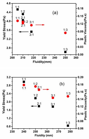 Correlations between rheological parameters and fluidity: (a) 5 min, (b) 90 min. Black square represents yield stress. Red circle represents plastic viscosity.