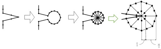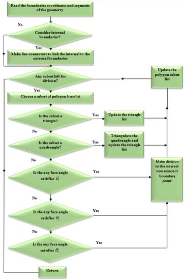 An appropriate technique must be used during each load step to ensure that the generated background mesh covers the whole computational domain. The background mesh is generated by using the dichotomy approach, which uses all of the original boundary nodes or mainly the external boundary nodes of the shape to build the background mesh triangular. In this method, the computing area was modeled as a polygon. The boundary triangulations were acquired by splitting and repeatedly dividing the computational area into two sub-sets till the simplest polygon sub-sets were generated. Consequently, any internal boundaries, such as holes, must be connected to the external boundary by connecting lines. The internal boundaries would be compelled to be a part of the continuous line of the external boundaries, resulting in a polygonal computational domain. The clockwise direction is used to set the orientation of internal borders, whereas the counterclockwise direction is used to set the orientation direction of external boundaries. The shortest path between internal and external boundary points is used to construct the connector line [41]. The proposed method is shown in Figure 2, which begins by separating each initial identified boundaries points with a large face angle and producing an angle range for determining the closest nonadjacent point to be connected with a division line. The angle range has been selected in order to facilitate the generation of high quality polygon subset forms by the division. In the event that the search for a point not neighboring is unsuccessful, the division will begin at a position on the border that has a smaller face angle. In accordance with the precedence, the identification for the face angle size is as follows: As a result, in order to precisely represent the field singularity near the crack tip, singular elements must be constructed. As the advancing front technique creates triangle elements beginning from the boundaries faces, the region surrounding the crack tip is must to be separated before constructing of the singular elements [36]. This area is separated by creating nodes in the rosette form surrounding the crack tip and extracting the node at the crack tip and the connected boundaries segments. By introducing new boundary segments connecting the new nodes, the template region is temporarily “cut off” from the initial domain followed by the triangulation of the whole domain using the advancing front method. The triangles of the rosette elements are then formed, as shown in Figure 3. Finally, a mid-side is added to each triangle edge to create six node triangles, with the exception of the rosette components, where the mid side nodes for the triangle edges related to the crack tip are shifted a quarter of the edges length closer to the tip of the crack. The flow chart for generating the background mesh is shown in Figure 4.